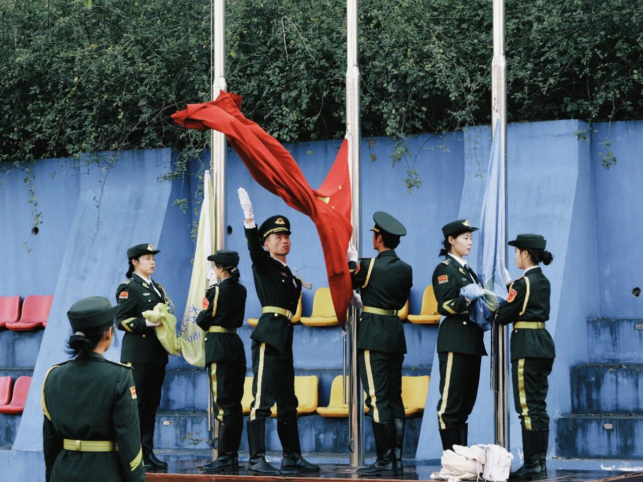 开幕式在庄严的升旗仪式中拉开帷幕。在雄壮激昂的国歌声中,鲜艳的五星红旗冉冉升起,全体师生肃立行注目礼。