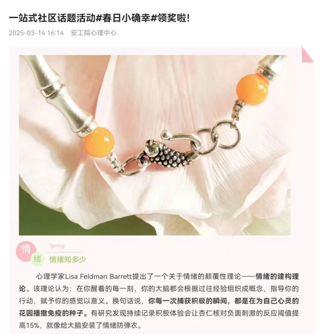 为进一步拓展心理健康教育覆盖面,解决学生线下参与活动不便的痛点,学院创新构建线上一站式心理活动社区,让学生足不出户即可便捷参与各类心理实践活动。线上社区话题设计紧扣学生心理需求,践行积极心理理念,在春季学期开展“你也是春天的一部分”“春日小确幸”等疗愈活动,在秋季学期开展“心动话语”分享传递温暖话语等暖心活动,活动参与和互动全流程线上完成,学生在宿舍即可一键接入,打破时空限制,累计参与超8000人次。这些创新实践,是学院深化心理健康教育改革的重要举措,既彰显了“以生为本”的育人理念,也为新时代高校心理工作数字化转型提供了有益探索。