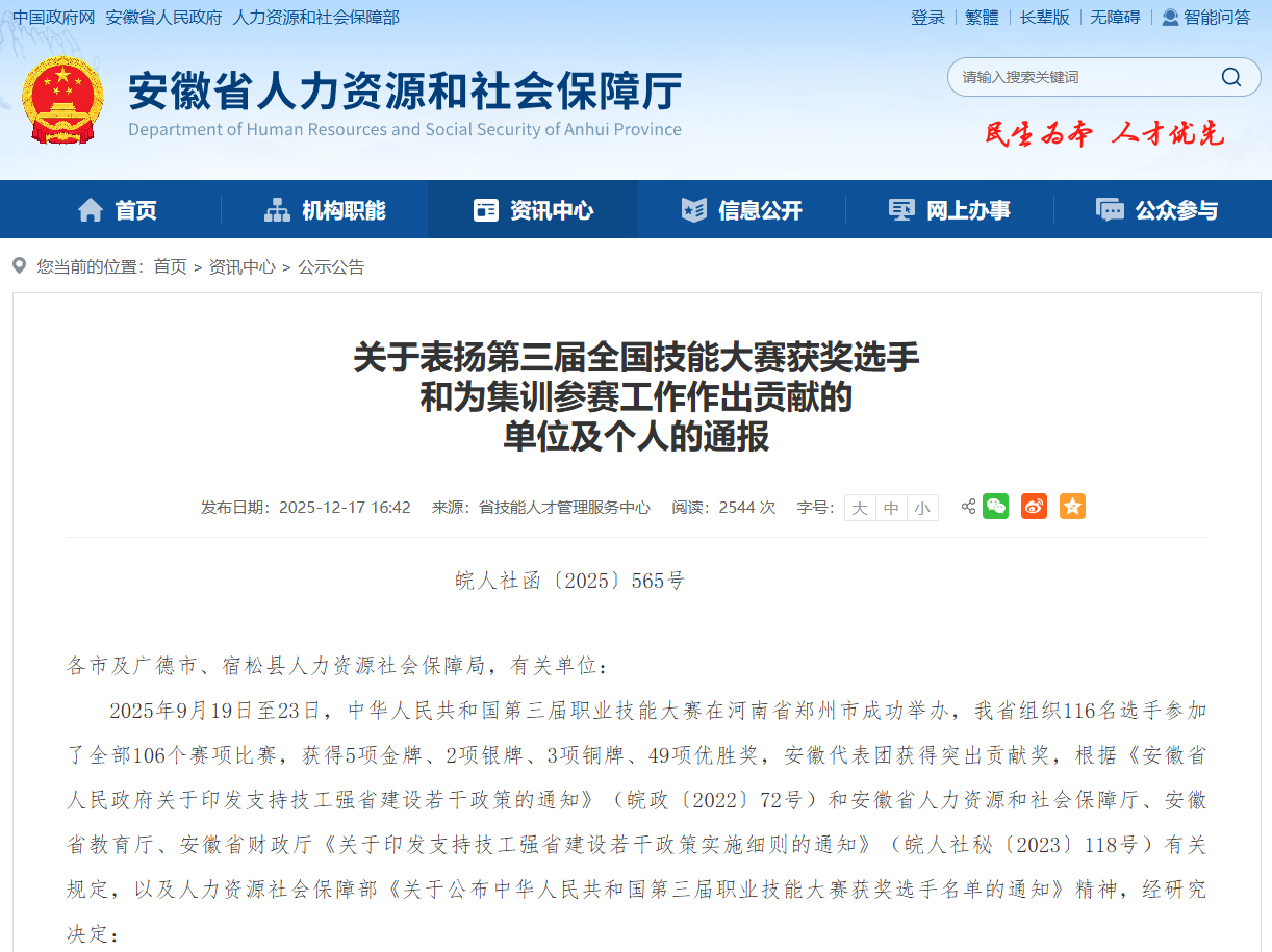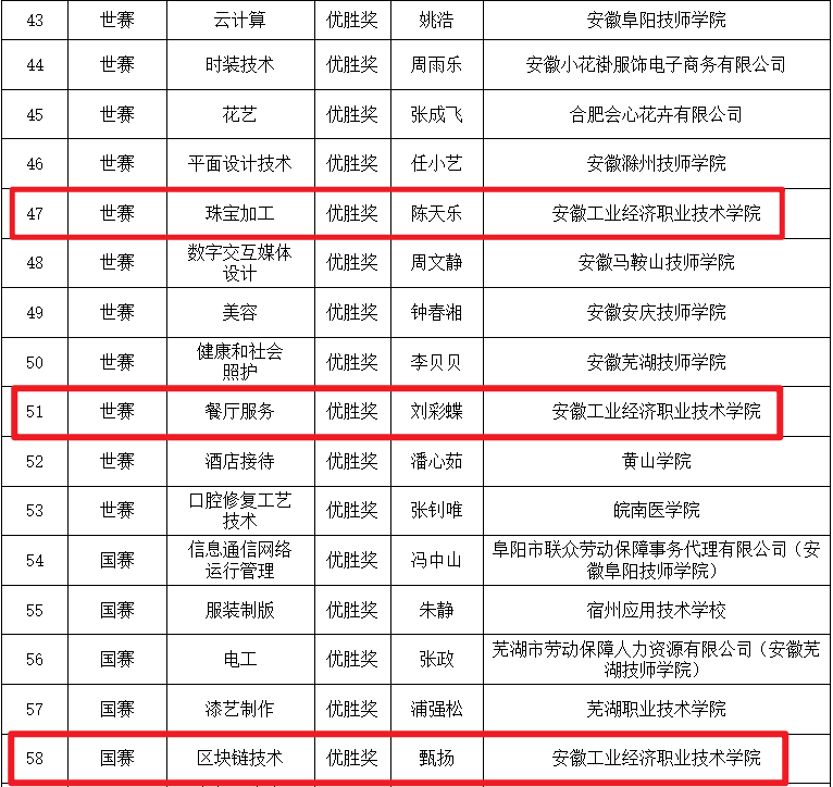 近日,安徽省人力资源和社会保障厅发布《关于表扬第三届全国技能大赛获奖选手和为集训参赛工作作出贡献的单位及个人的通报》,对我省在第三届全国职业技能大赛中取得优异成绩的选手及单位进行通报表扬。学院珠宝加工、餐厅服务、区块链技术三个赛项的参赛团队代表安徽省参赛,经过激烈角逐,全部荣获“优胜奖”,为安徽省及学院赢得了荣誉。