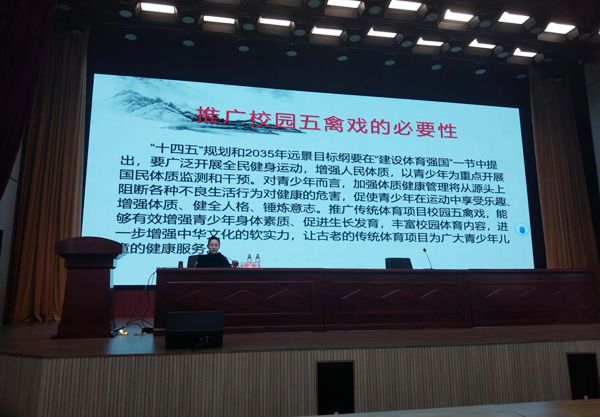 陈静从五禽戏的历史渊源、发展现状说起,阐述了校园五禽戏的具体内容、创编理念、创编过程及健身功效等内容。