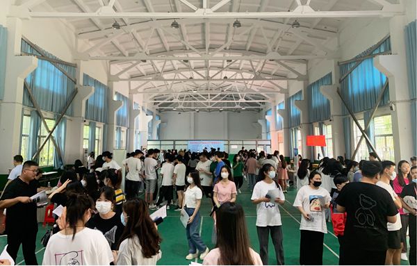 双选会开始前,企业人员提前报备两码和48小时核酸检测阴性报告,核查无误后进校。下午14点整,双选会正式开始,学生全程佩戴口罩,有序错峰进场。