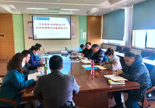 本网讯(马克思主义学院供稿 审核:佘东)为深入学习贯彻习近平新时代中国特色社会主义思想,进一步加强我院思政课建设工作,更好发挥思政课立德树人关键课程作用,准确把握新教材精神实质,提升教学质量,11月24日,马克思主义学院在行政楼三楼会议室召开2021年秋季学期第三次集体备课会,党支部书记肖勇及全体教师参加会议,副院长刘仁三主持备课会。