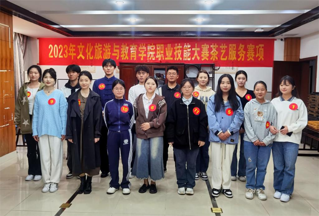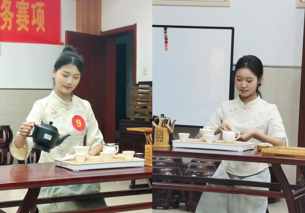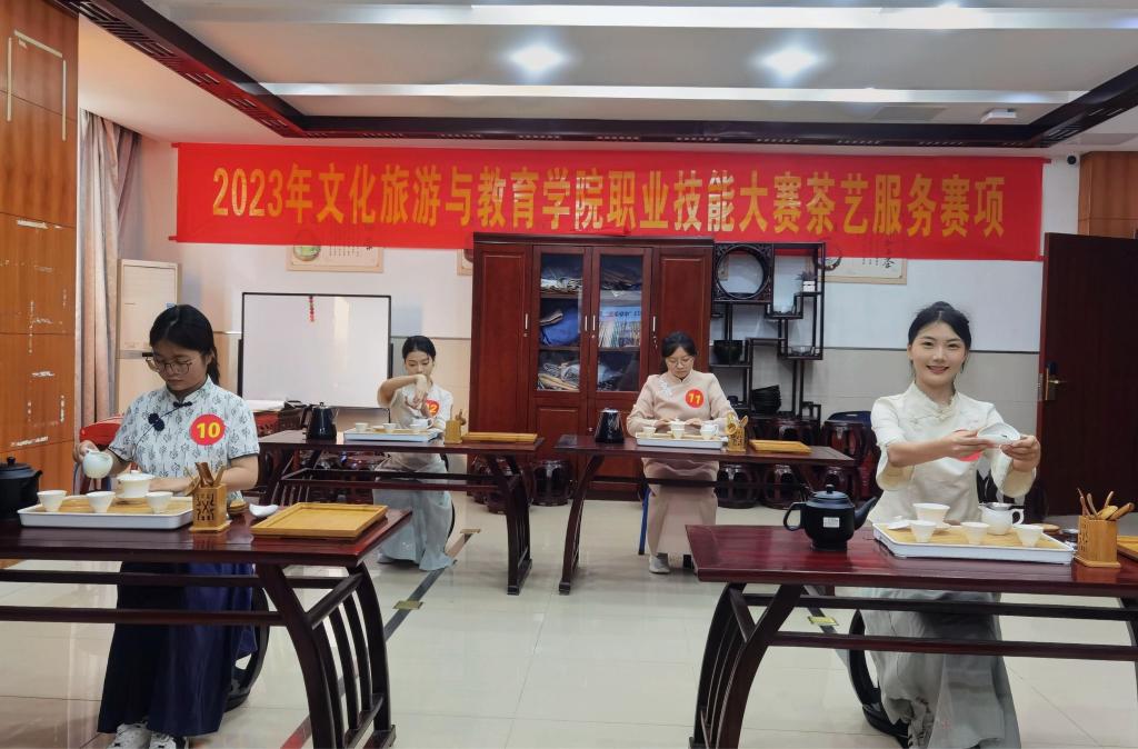 本网讯(文化旅游与教育学院:吕刚 审核:谌莲莲 佘东)11月7日下午,文化旅游与教育学院承办的2023年“中华茶艺”职业技能大赛在山水实习宾馆茶艺实训室顺利进行。16名选手以茶为媒,同台献技,用优雅的茶艺表演诠释了中华茶文化的独特魅力。