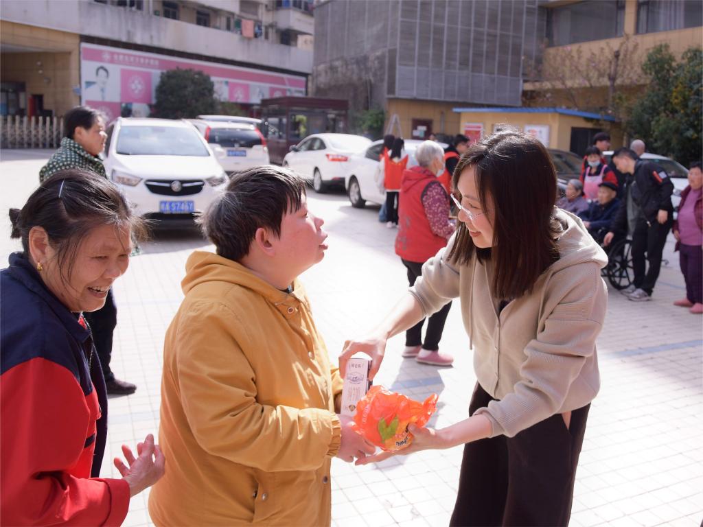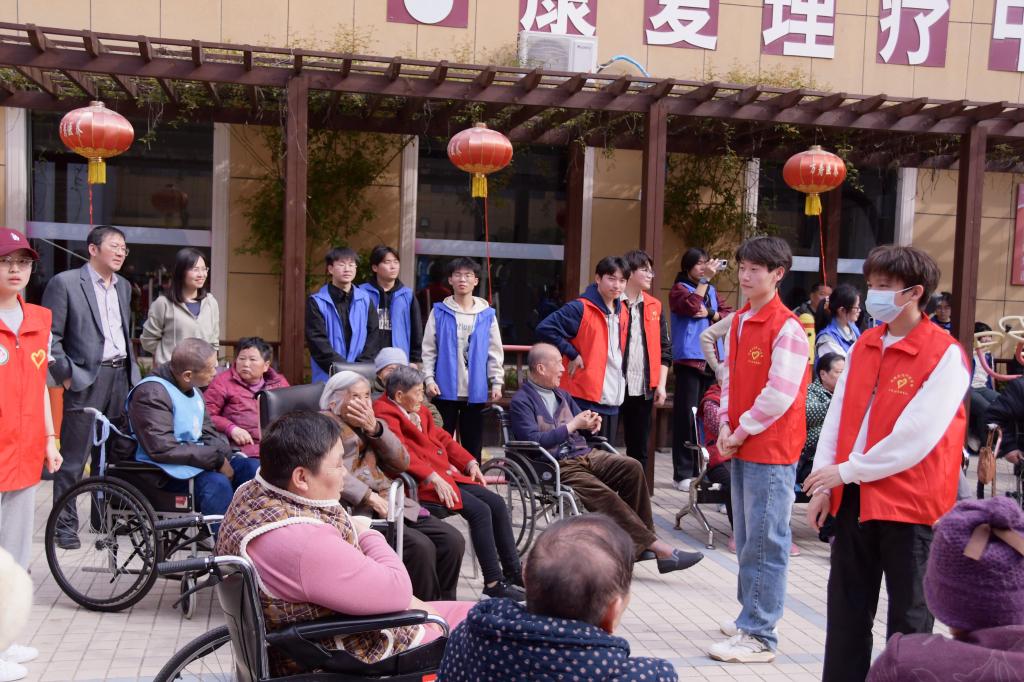 9时左右,志愿者们配合敬老院工作人员将老人们搀扶到院内广场感受春天的气息,并为老人们精心准备了系列互动游戏。在志愿者们的带动下,老人们开心地唱起歌曲,笑容爬上他们的脸庞,现场气氛融洽,其乐融融。