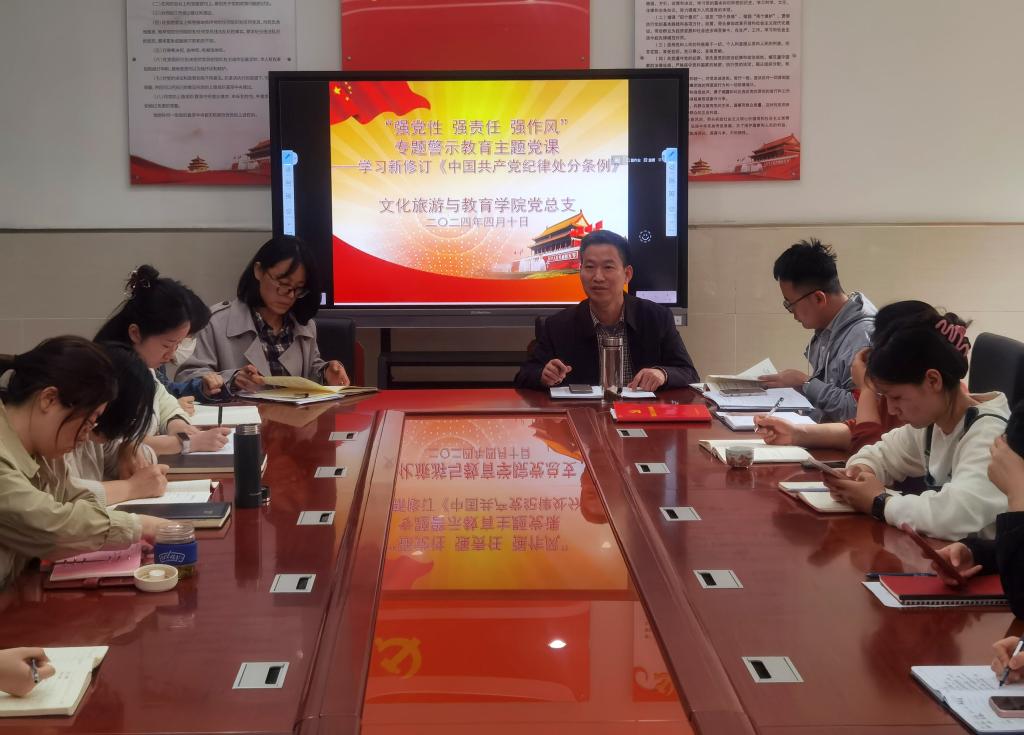 文化旅游与教育学院党总支将学习新修订的纪律处分条例作为学院纪律教育的重要一课,推动全院党员教师深刻认识修订纪律处分条例的重要意义和丰富内涵,促进党员教师将学习成果内化于心、外化于行,在学院教学和学生管理工作实践中强化自我约束,提高免疫能力,为学院高质量发展作出积极贡献。