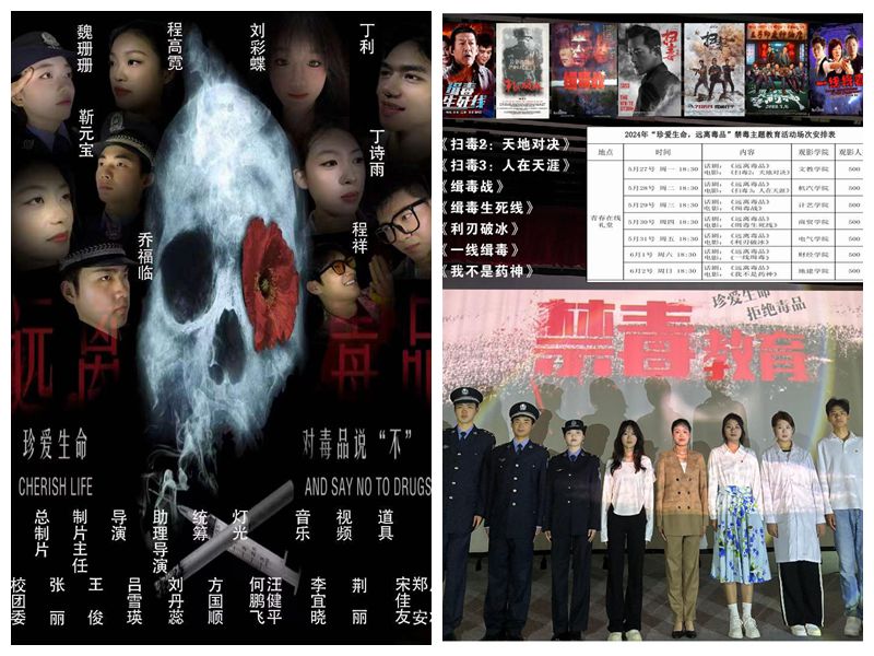 左:播放禁毒影片 右:展演禁毒主题创编话剧