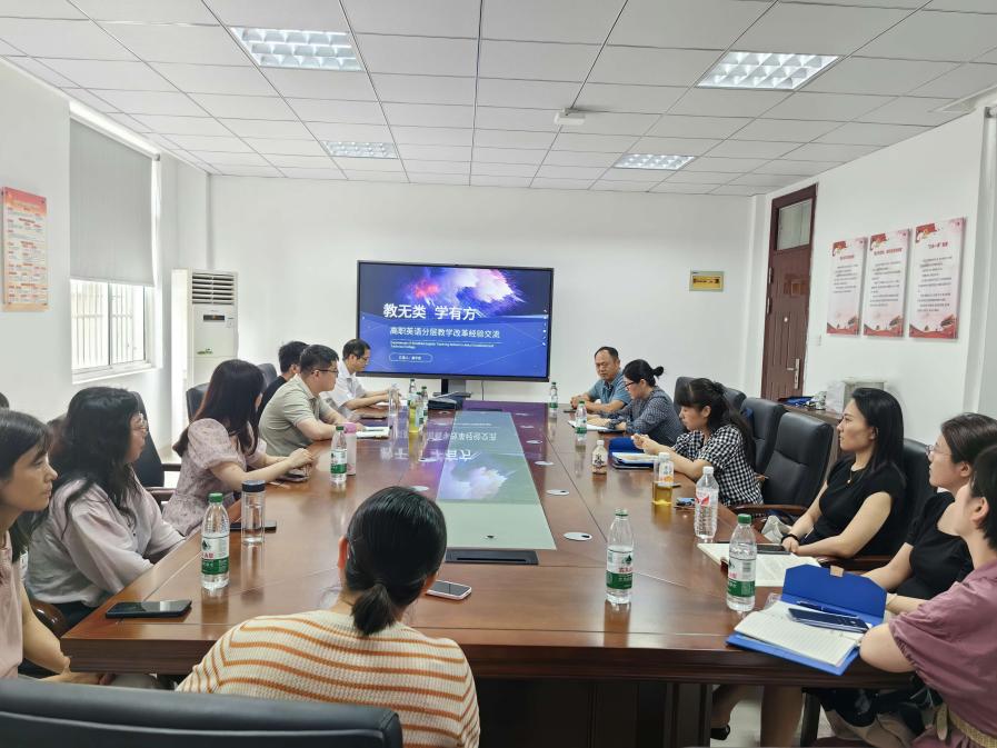 本网讯(公共教学部:白小星 审核:郭德法 佘东)6月27日,公共教学部在综合楼二楼会议室召开公共英语教学改革研讨会,会议邀请安徽职业技术学院公共英语教研室主任吴平安做经验分享,公共教学部主任郭德法主持会议并发言,公共英语教研室全体教师参会。