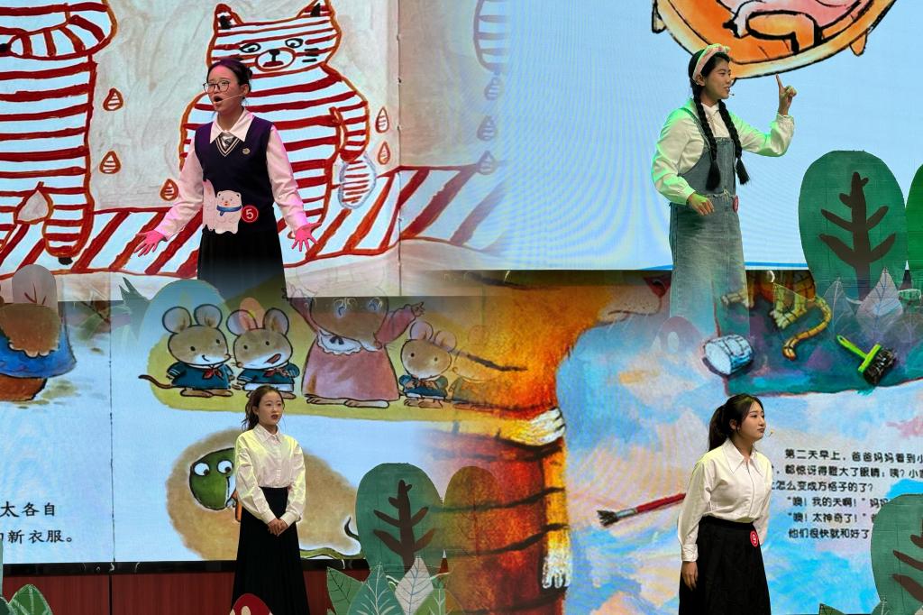 决赛现场,选手们选取的故事各具特色,《千万别喝南瓜汤》带着神秘又新奇的气息,仿佛将大家带入了一个奇妙的童话世界;《大卫不可以》用充满童趣的情节展现了孩子成长中的小插曲,引得观众不时发出会心的笑声;《七只小青蛙穿新衣呀》则凭借活泼可爱的角色塑造,让整个报告厅都沉浸在欢乐的氛围里;《母鸡萝丝去散步》那轻松诙谐的故事发展,牢牢抓住了每一个人的注意力;还有《我想吃一个小孩》更是以独特的视角,引发大家的思考与想象。选手们绘声绘色地讲述,配合着恰到好处的肢体动作和表情,将故事中的角色演绎得活灵活现,赢得了阵阵掌声和喝彩声。