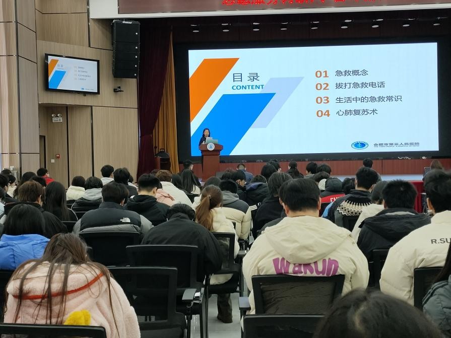 本网讯(李昀芸 审核:王厚红 佘东)3月4日下午,由计算机与艺术学院团总支联合合肥市第三人民医院组织的"急救知识进校园"专题讲座在图书馆一楼报告厅举行。本次讲座特邀合肥市第三人民医院急救科倪军喜主任、王晓媛医师担任主讲,计算机与艺术学院团总支书记李昀芸主持,合肥市第三人民医院团总支书记李娜,计算机与艺术学院辅导员徐玉婷、李燕、刘飞及200余名学生共同参与,讲座现场学习氛围浓厚。