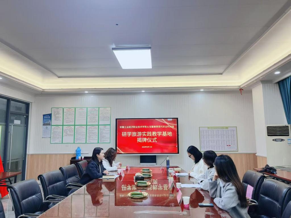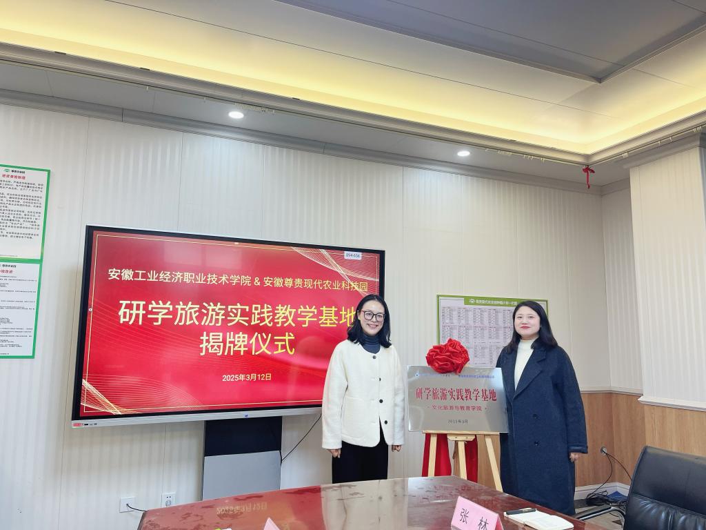 本网讯(文化旅游与教育学院:孔妮 审核:邱竹青 佘东)为深化产教融合、推动校企协同育人,3月12日下午,星空电竞官网与安徽尊贵现代农业科技园合作共建的“研学旅游实践教学基地”揭牌仪式在基地会议厅举行。星空电竞官网文化旅游与教育学院院长谌莲莲、安徽尊贵现代农业科技园总经理董娟娟出席仪式并致辞,文化旅游与教育学院旅游教研室主任韩珊珊、研学课程负责人张林、青年教师孔妮、科技园文旅部相关负责人参加活动。