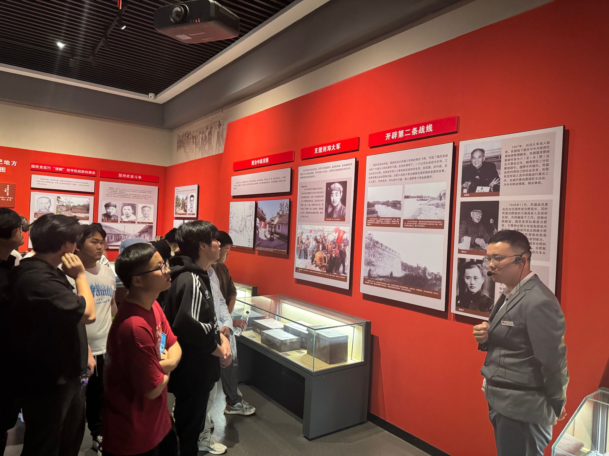 活动现场,师生们在讲解员的引导下,依次参观了“革命烽火”“建设征程”“改革浪潮”“新时代使命”等主题展区。一幅幅珍贵的历史照片、一件件厚重的革命文物、一段段生动的影像资料,将中国共产党在合肥地区的奋斗历程娓娓道出。马克思主义学院第二党支部书记、“中共党史”课程组负责人乔代富在现场授课时表示,“把思政课堂搬到党史馆,就是要让同学们在沉浸式体验中深刻理解党的历史,让红色基因真正融入血脉。”学生代表黄浩在参观后深有感触地说,“站在革命先辈奋斗过的地方学习党史,比在教室里听课更容易受到触动,让我更加明白了新时代青年的责任与担当。”活动结束后,师生们围绕参观学习内容展开热烈讨论,并撰写心得体会。