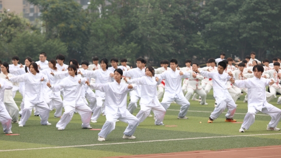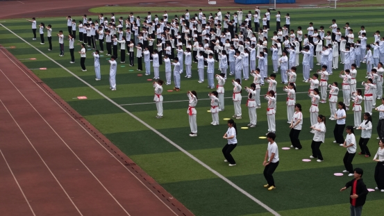 作为特色赛项的民族传统体育比赛备受师生青睐,吸引了1500名选手参与八段锦、五禽戏、八法五步和太极拳的激烈角逐。赛场上,数百名选手组成一个个方队,队员们身着色彩鲜亮的服饰,动作整齐划一,一招一式刚柔并济,场面壮观,气势恢弘,既展现了中华传统体育的深厚底蕴,又以极具观赏性的竞技形式赢得了现场阵阵喝彩。在民族传统体育项目开赛仪式上,党委副书记周和平表示,体育文化节是竞技比拼、文化传承与教育成果检验的重要平台,开展民族传统体育运动对增强文化认同与自信,增强学生体质、促进文化传播都有积极意义,她希望选手们积极参与比赛、尽情享受比赛,弘扬体育精神和文化自信。