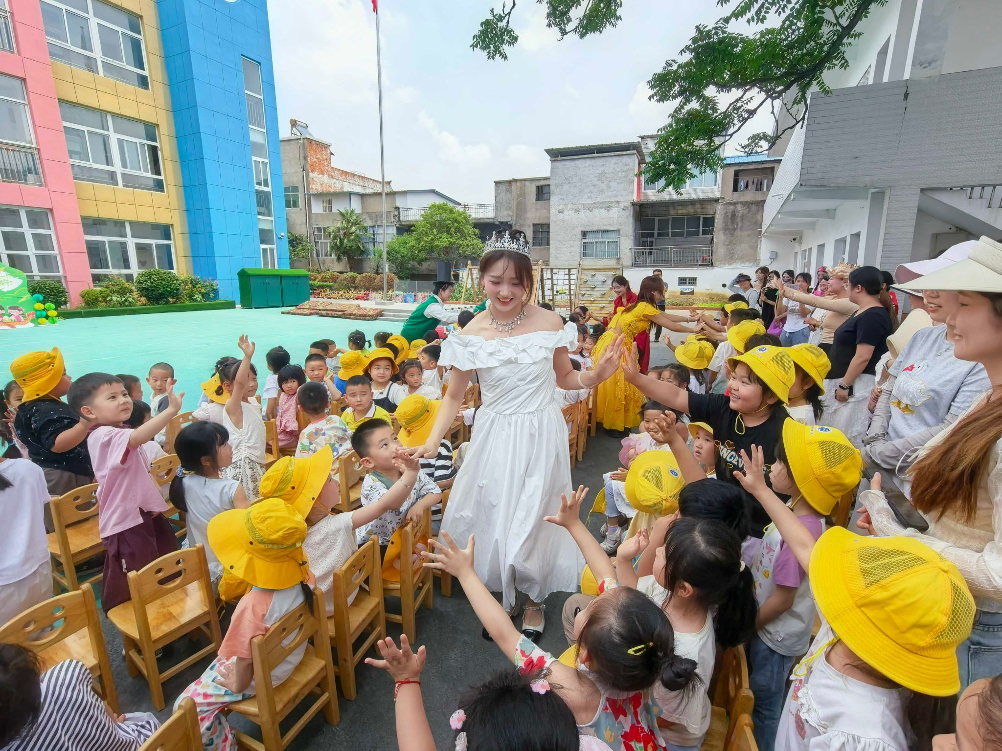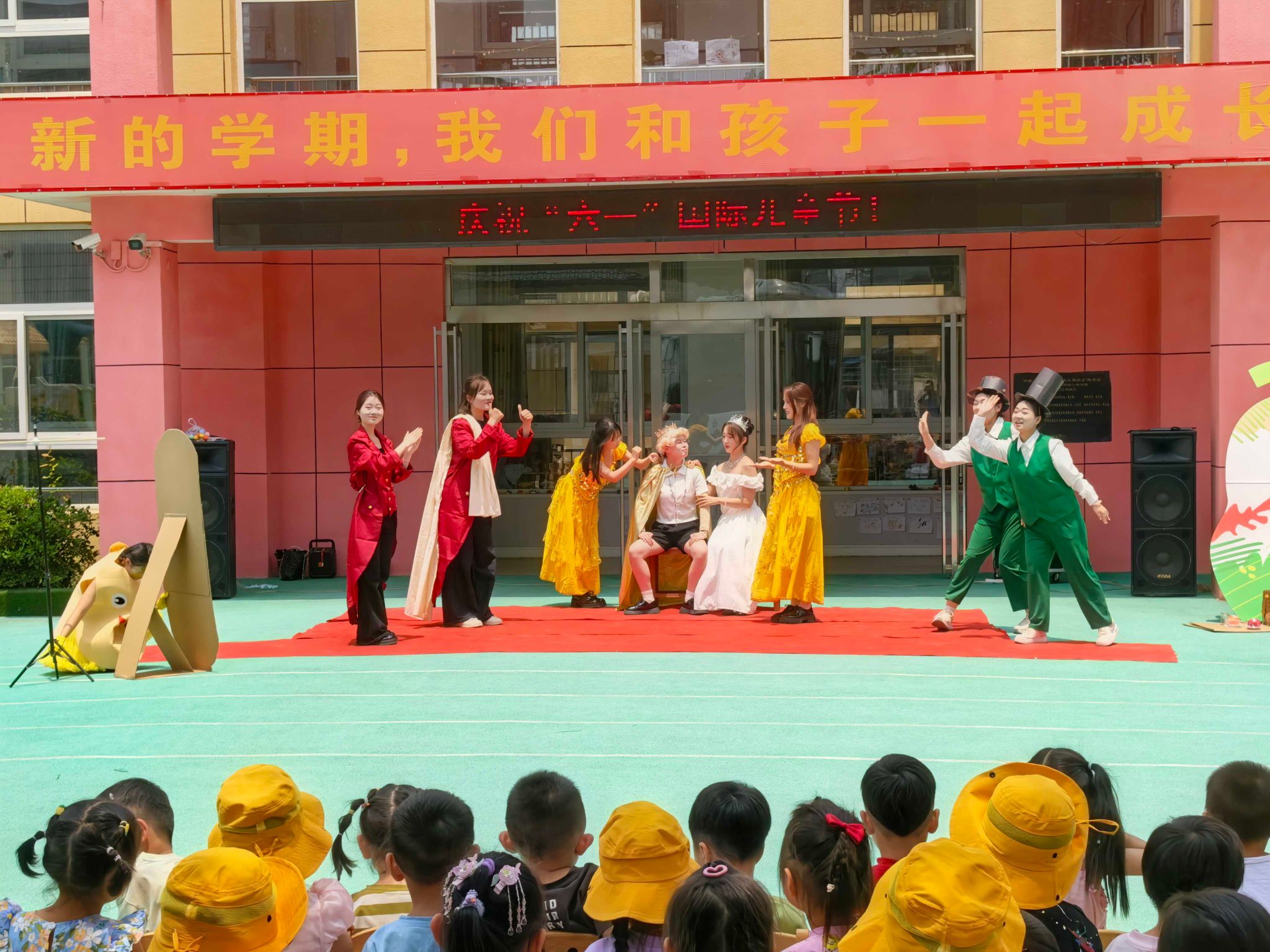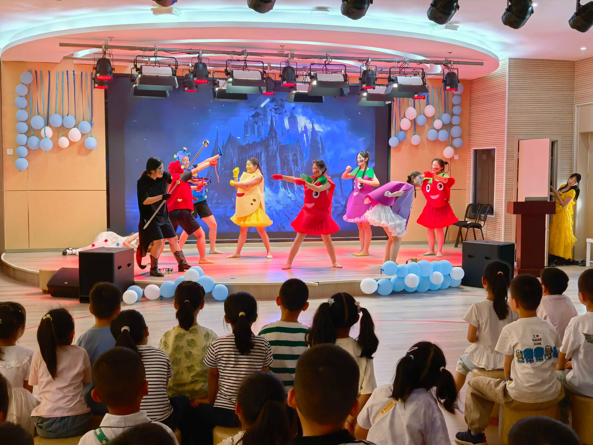 活动当天,学前教育专业学生精心编排的儿童剧成为最大亮点。在丁集镇中心幼儿园,经典剧目《新-皇帝的新衣》以诙谐幽默的表演形式重现,同学们以生动的角色演绎和趣味十足的互动环节,带领孩子们走进充满勇气与友爱的童话世界,孩子们聚精会神观看,不时爆发出阵阵欢呼与掌声,现场氛围热烈。在平安东苑幼儿园,充满健康知识的《蔬菜精灵》让孩子们沉浸其中,通过夸张的肢体语言和感染力极强的台词,在欢笑中引导孩子们了解水果的营养价值,养成不偏食不挑食的良好饮食习惯。扮演水果精灵的演员与小朋友一起攻击“病毒”,使得现场欢声笑语不断。