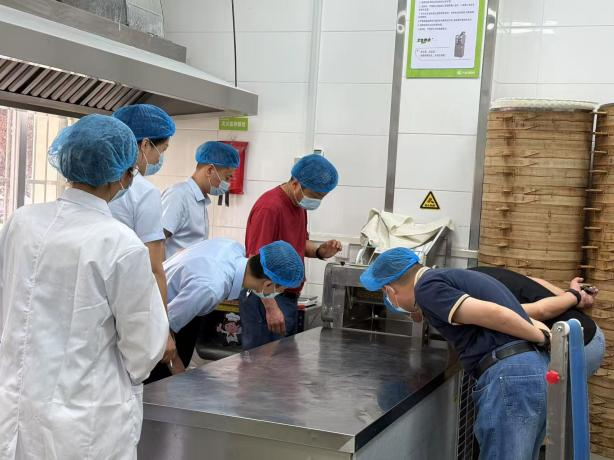 此次专项检查以校园食堂设施设备为核心,重点对绞肉机、压面机、和面机、等食材加工设备进行检查,检查内容包括设备清洁状况,查看是否残留食物残渣,并询问食堂工作人员设备日常清洗流程、频率,核验清洗记录完整性与规范性;设备运行状况,排查是否存在损坏、老化等影响正常使用及食品安全的问题;设备存放环境,确认是否符合卫生标准,是否配备防虫、防鼠等防护措施。