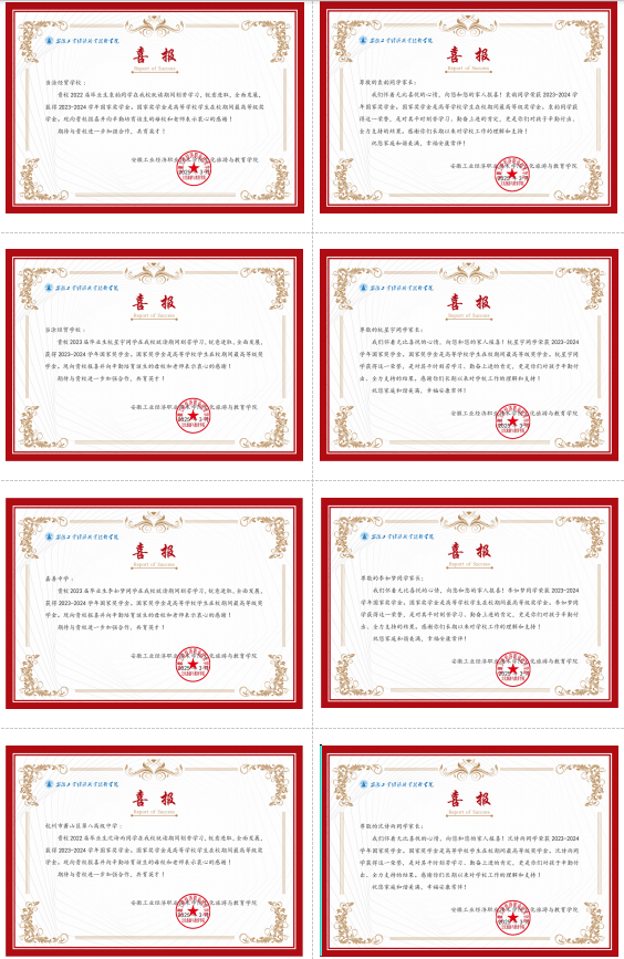 红色喜报暖人心,家校携手共育人。近日,文化旅游与教育学院开展了一场有意义的活动,向2023-2024学年荣获国家奖学金的学生家庭和原高中(中职)毕业学校寄送喜报,家校共同分享这份荣耀与喜悦。
