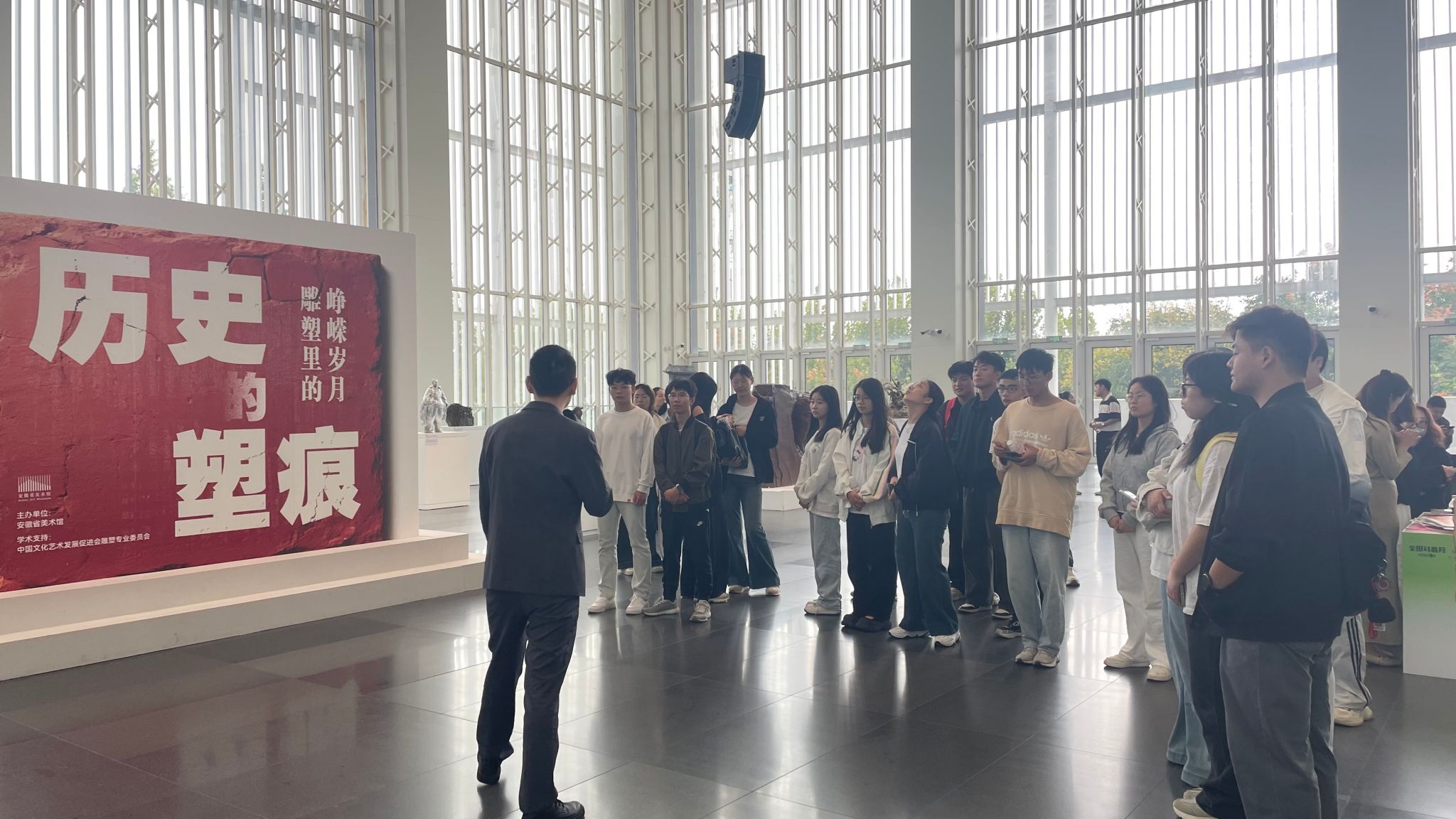 在安徽省美术馆,师生参观“历史的塑痕:雕塑里的峥嵘岁月”展览。今年是中国人民抗日战争暨世界反法西斯战争胜利80周年,八十载光阴奔涌不息,那些血与火的记忆从未褪色,在岁月沉淀中愈发清晰,深深烙印在华夏儿女灵魂深处。讲解员围绕展览中的雕塑作品,从创作背景展开详细解读,阐释雕塑技法如何通过细节刻画传递人物情感与时代精神,深入解读每一件作品所承载的抗战精神内核与深厚文化内涵,让师生们透过雕塑直观感知抗战时期的家国情怀与民族气节。