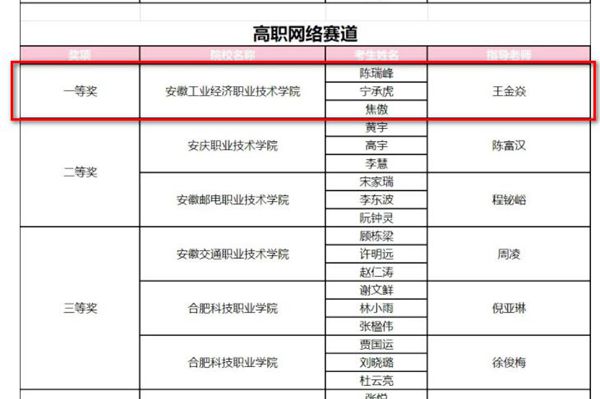 本次大赛分“网络赛道”“云赛道”“计算赛道”三个赛道,共有来自42所高校的1657名学生参加,经过前期的激烈角逐,35所高校的285名学生脱颖而出,进入决赛范围。在竞争更为激烈的决赛阶段,我院指导教师和参赛学生充分发扬不怕苦不怕累、顽强拼搏的精神,全身心地投入到赛程中,最终由王金焱、孙轲老师指导,陈瑞峰、宁承虎、焦傲三名同学组成的参赛队获得高职网络赛道一等奖,并顺利拿到代表安徽省参加华为ICT大赛中国区总决赛的资格;冯智慧、朱梦想、李文静与郭浩博、马明明、夏小东组成的两支参赛队均获得高职网络赛道优胜奖;孙爱珲、张欢欢、张恒组成的参赛队获得高职云赛道优胜奖;由我院与合肥师范学院联合培养的本科生牛永浩、李乾坤、孙树娟组成的参赛队获得本科网络赛道优胜奖。