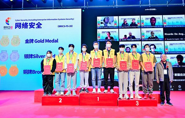 本网讯(计算机与艺术学院供稿 审核:佘东)11月1至6日,2022金砖国家职业技能大赛决赛在厦门举办,我院朱晓彦、王庆宇老师指导的参赛选手甄扬、张鹏杰、徐浩然在“网络安全”赛项中以总分第一的成绩获得国际赛金牌、国内赛一等奖。孙荣会老师指导的学生谢奥成在“云计算”赛项中获得国内赛二等奖,余战秋老师指导的学生张家辉在“区块链”赛项中获得国内赛三等奖。我院也是安徽省13所参赛院校中唯一获得金奖的高职院校。