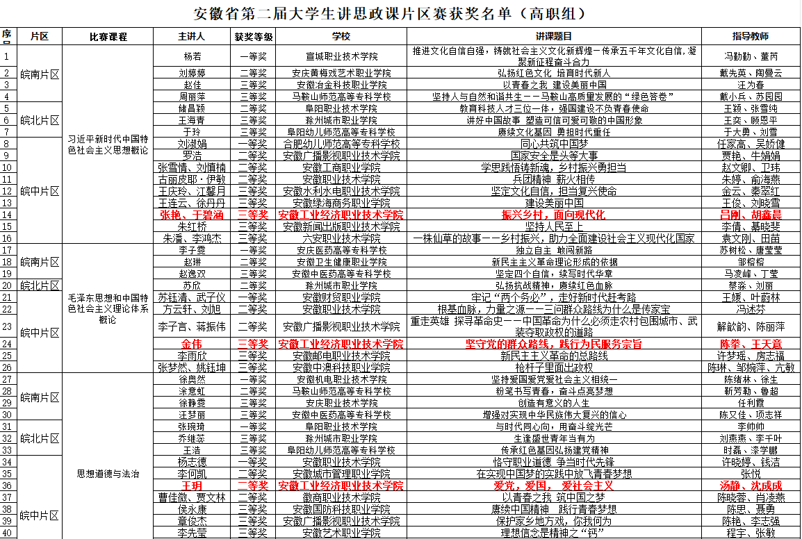 据悉,本次比赛由安徽省委教育工委主办,分为初赛、片区赛和决赛,按赛制规定,高职院校组按课程各校最多可报四个团队参赛,片区赛本专科高校分课程按一等奖5%、二等奖10%、三等奖20%的比例共评出获奖作品145个,获得片区一、二等奖的选手将参加安徽省决赛。