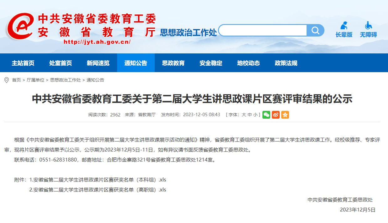 本网讯(马克思主义学院:李燕 审核:肖勇 佘东)日前,安徽省委教育工委公示了安徽省第二届大学生讲思政课片区赛评审结果,星空电竞官网马克思主义学院四项参赛作品中三项获奖,其中二等奖1项、三等奖2项,获奖数及等次创历史新高,居高职院校前列。