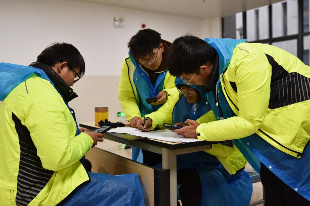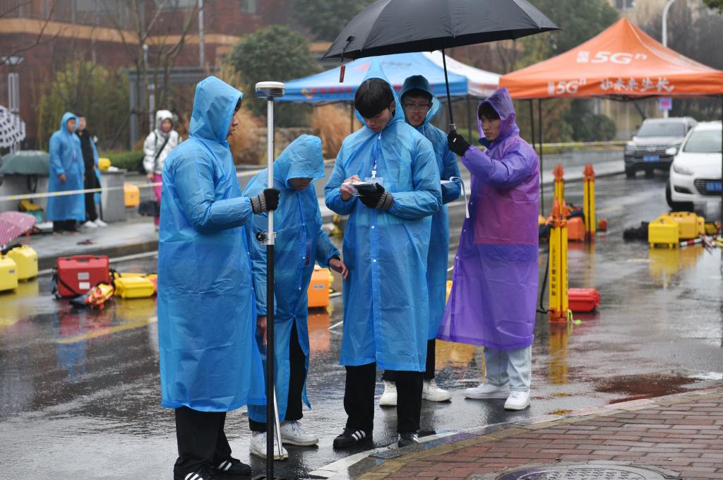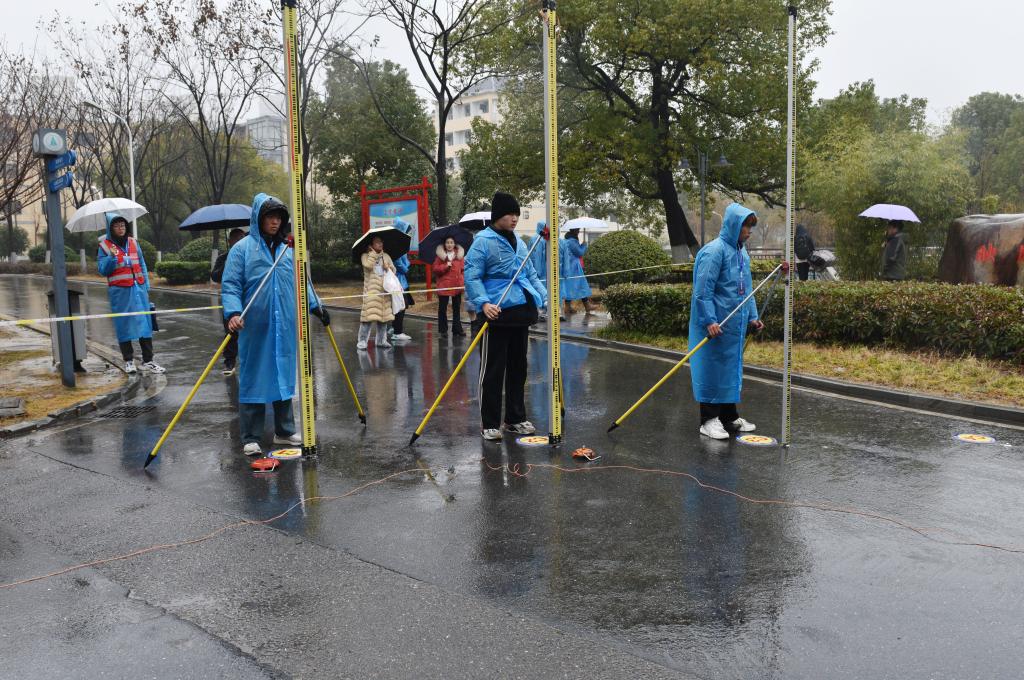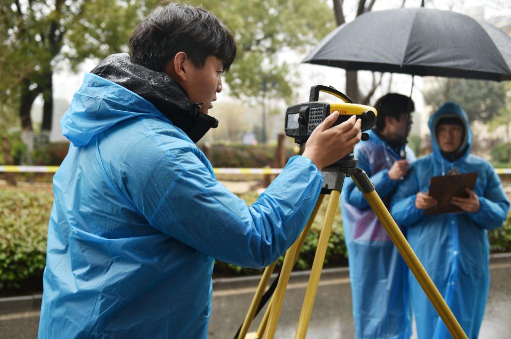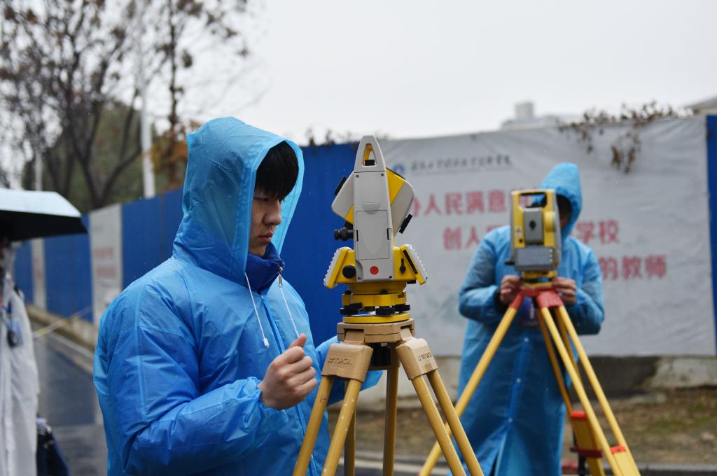 比赛虽逢冬雨连绵,湿冷交加,但参赛队员们充分发挥了艰苦奋斗、顽强拼搏的精神。他们穿着雨衣,拿好设备,快速进入测量目标区域,一丝不苟地完成架站、调整、读数、记录、换站等环节。参赛队分工明确、精诚协作,有的负责测量、有的负责记录,他们争分夺秒地从一个点奔向下一个点,播报数据的喊声在赛场上此起彼伏,现场紧张激烈又严谨有序,体现出参赛选手扎实的专业基础和良好的综合素质。