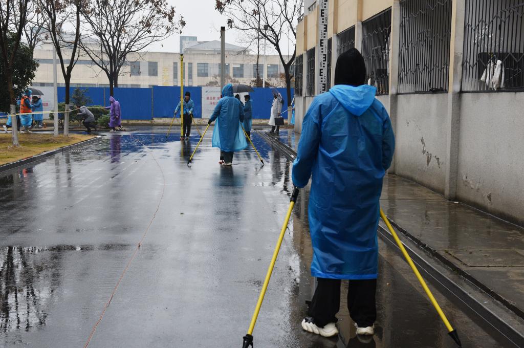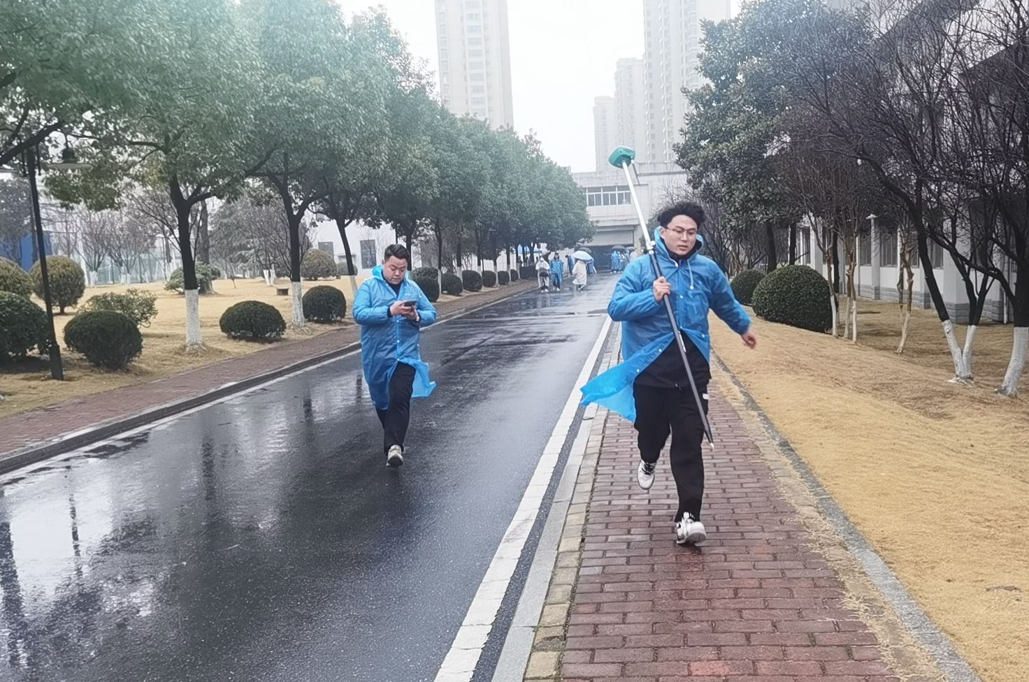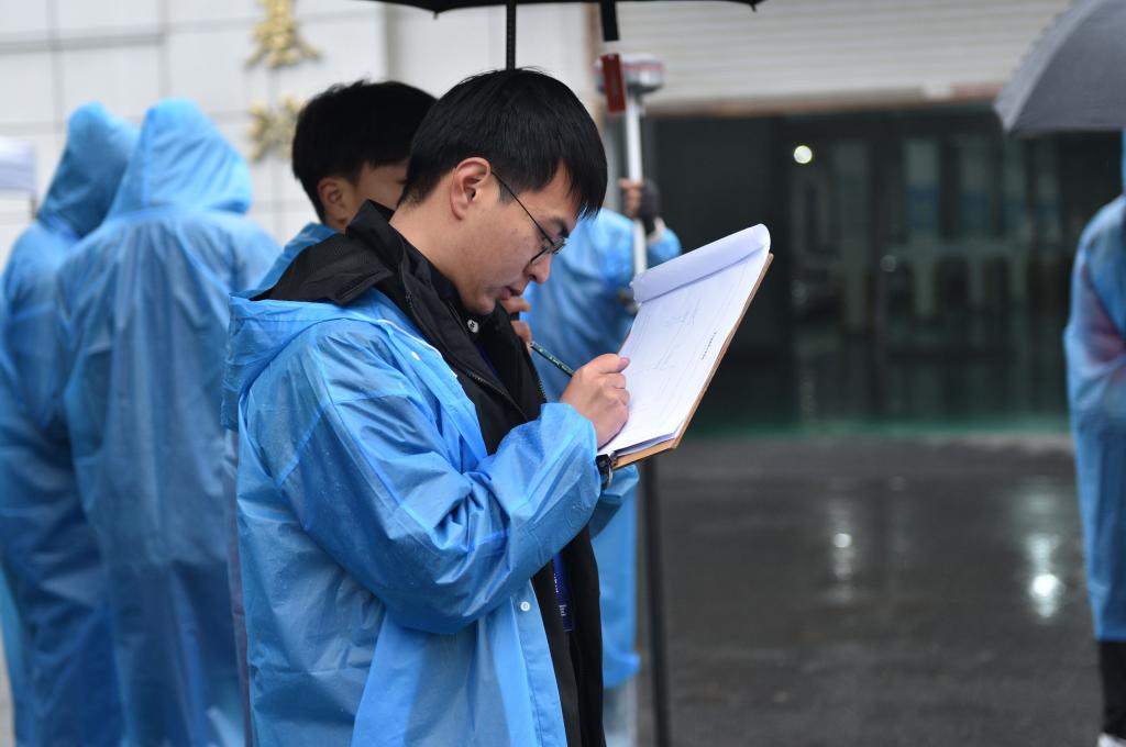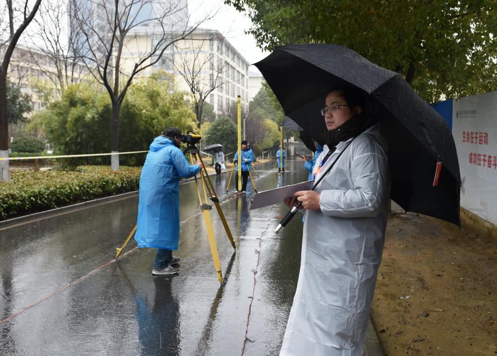 比赛虽逢冬雨连绵,湿冷交加,但参赛队员们充分发挥了艰苦奋斗、顽强拼搏的精神。他们穿着雨衣,拿好设备,快速进入测量目标区域,一丝不苟地完成架站、调整、读数、记录、换站等环节。参赛队分工明确、精诚协作,有的负责测量、有的负责记录,他们争分夺秒地从一个点奔向下一个点,播报数据的喊声在赛场上此起彼伏,现场紧张激烈又严谨有序,体现出参赛选手扎实的专业基础和良好的综合素质。