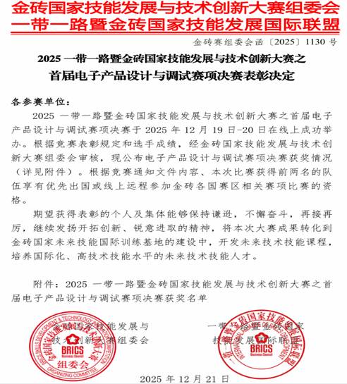 近日,2025年一带一路暨金砖国家技能发展与技术创新大赛“智能产品设计与调试”赛项决赛圆满落幕。学院选派4名学生参与角逐,在与全国300余名选手的激烈竞争中脱颖而出,最终获一等奖1名、二等奖1名、三等奖2名。