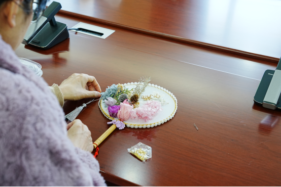 活动现场花香四溢,气氛温馨。女职工们充分发挥想象力和创造力,将一朵朵鲜花错落有致地搭配在一起,制作出一个个独具匠心的花艺作品。在团扇制作环节,大家用干花、胶水等材料,在团扇上进行创作,将对生活的美好祝愿融入“花语”中,绘出一幅幅精美的干花团扇作品。