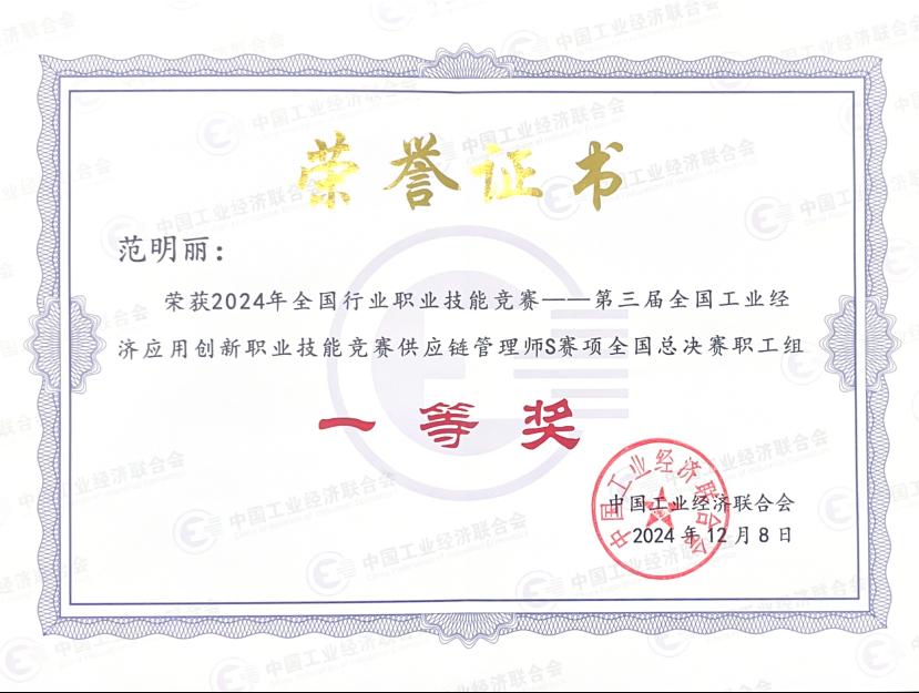 本网讯(财经学院:范明丽 审核:李学锋 佘东)2024年全国行业职业技能竞赛——第三届全国工业经济应用创新职业技能竞赛供应链管理师S赛项全国总决赛于12月7日至8日在广州市交通技师学院举行。财经学院专业教师范明丽老师以第五名的好成绩斩获职工组一等奖,并荣获安徽省技术能手称号。