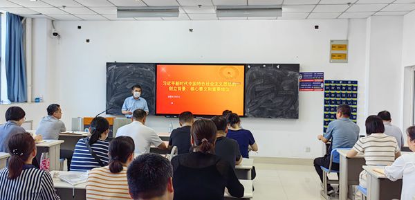 本网讯(公共教学部党支部:胥海云 审核:郭德法 佘东)7月5日下午,党委委员、副院长崔景茂教授在主教603教室以《习近平新时代中国特色社会主义思想的创立背景、核心要义和重要地位》为题讲授主题党课,报告由商贸学院党总支副书记张善智主持,商贸学院党总支、公共教学部党支部、教务处、质量办、鉴定所全体党员教师参加。
